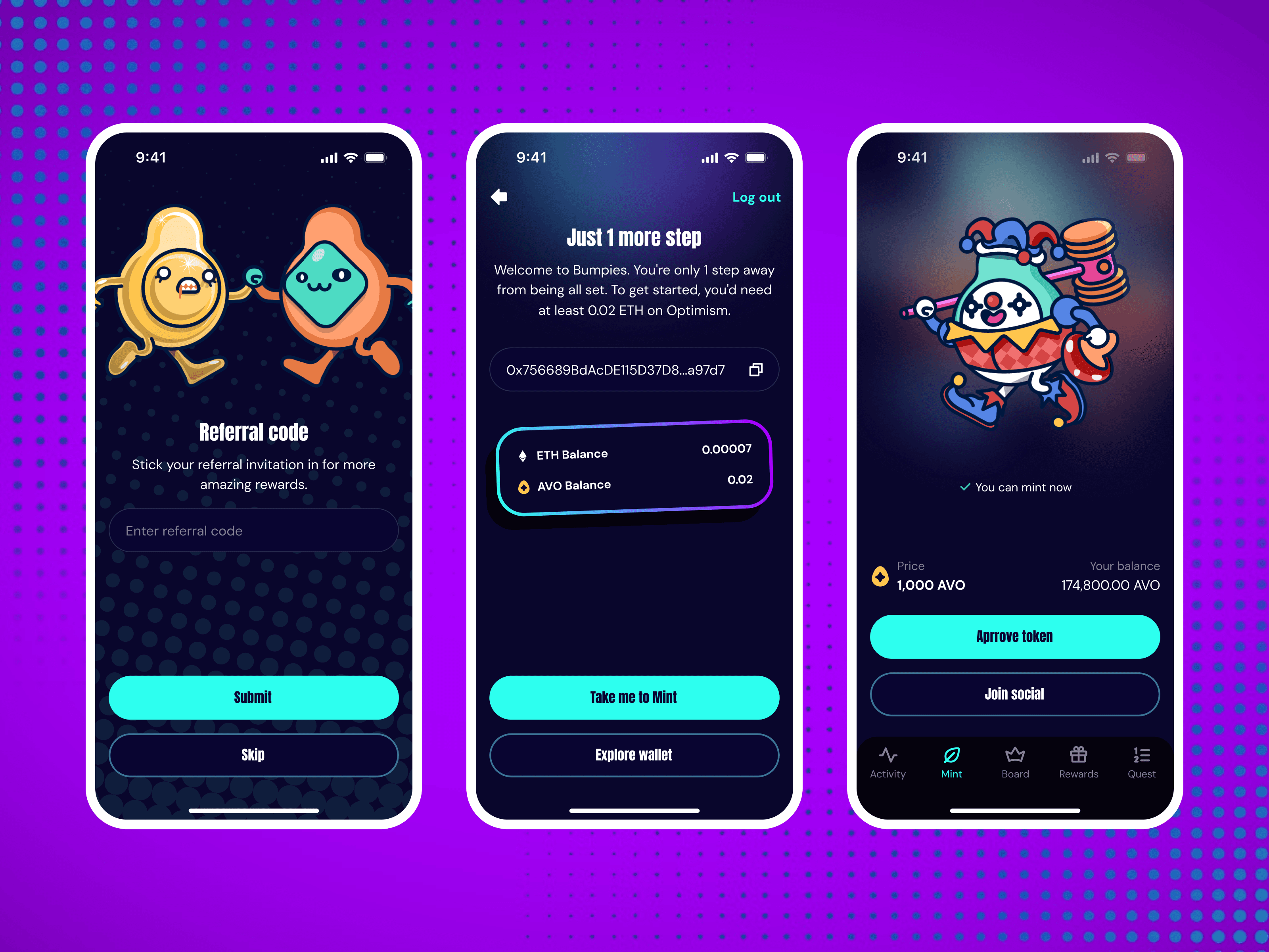 Ecosystem connection: Bumpies aren't standalone — they're a key into Avocado DAO's broader game and DApp ecosystem. The design had to make that utility feel real and tangible, not speculative