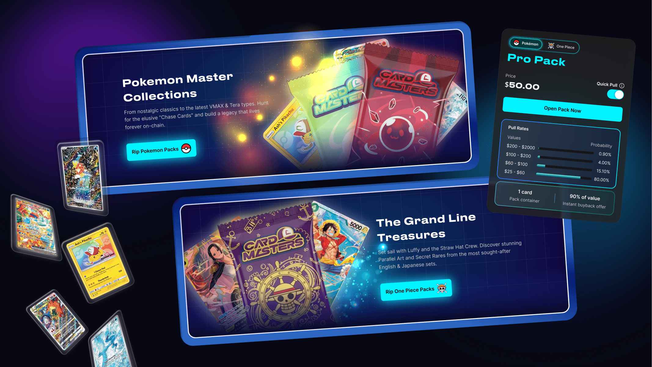 CardMasters.io is a platform where users open digital trading card packs online and receive real physical cards — either shipped to their address or instantly credited back at 90% of market value. It sits at the intersection of collectibles, Web3 ownership, and e-commerce, targeting both serious collectors and casual pack-openers.